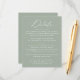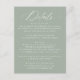 Die elegante weiße Kalligraphie auf einem ruhigen, grünen Hintergrund der Hochzeitsdetails der Umzäunung bietet eine moderne und stilvolle Möglichkeit, wichtige Informationen mit Ihren Gästen zu teilen. Passen Sie die Karte mit Ihren Hochzeitsdetails an, wie Empfang-Informationen, Hotelunterkünfte und Hochzeitswebsite, die alle in fett weißer Schrift dargestellt sind, um Klarheit zu schaffen. Die Einfachheit und Eleganz des Designs machen es zu einem idealen Ort für lässige und formelle Hochzeiten zu jeder Jahreszeit. Fügen Sie diese schöne und funktionelle Karte Ihrem Hochzeitsgeschirr hinzu, damit Sie einen unvergesslichen Aufenthalt verbringen können.