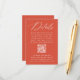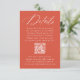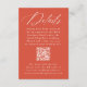 Fügen Sie Ihrer Hochzeitssuite eine lebendige Touch mit dieser QR-Code Hochzeitsdetails Gehäuse-Karte, mit "Details" in eleganter weißer Kalligrafie auf einem warmen Verona Sonnenuntergang-orange Hintergrund. Dieses moderne Design ist ideal für Hochzeiten zu jeder Jahreszeit und eignet sich sowohl für Feiern als auch für lässige Feierlichkeiten. Paare lasse wichtige Details wie Empfang-Informationen, Hotelunterkünfte und ihre Hochzeitswebsite in fett weißer Schrift. Die Karte enthält einen komfortablen QR-Code, der den Gästen einen schnellen Zugriff auf die Hochzeitswebsite des Paares für weitere Informationen ermöglicht. Stilvoll und praktisch, ist diese Einschließkarte die perfekte Ergänzung zu Ihrem Hochzeitsgeschirr.