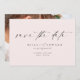 Das moderne Classic Blush Pink Wedding Save The Date verbindet ein zeitgenössisches minimalistisches Design mit elegantem Drehbuch in einem sanften Rosa, ideal für Frühlings- oder Sommerfeiern. Es bietet eine Möglichkeit für ein persönliches Foto und besticht durch sein modernes und gleichzeitig boho-Ambiente. Wenn Sie Hilfe bei der Anpassung benötigen, können Sie sich gerne an die Wünsche der Gäste wenden.