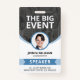 Ein modernes Abzeichen für Tagungs- und Veranstaltungsgäste, Vip's, Lautsprecher oder Mitarbeiter. Das Design zeigt die Personen Foto, sowie den Namen und Beruf der Personen. Die Personenbezeichnung wird in weißen Buchstaben auf farbigem Hintergrund dargestellt. Das moderne Konferenz ID-Abzeichen kann auf Wunsch ein personalisiert geeignetes Foto hinter dem Veranstaltungstitel sein. Die Rückseite dieses ID-Abzeichens ist leer und für Sie geöffnet, um weitere Informationen, wie z.B. einen Bar-Code oder Details von Event-Sponsoren, hinzuzufügen. Die Farben können personalisiert sein, um dem Farbschema Ihres Unternehmens zu entsprechen.