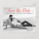 Moderne lebende Korallenskripte Hochzeit Save the Date Foto Postcard. Dieses zeitgenössische typografische Save the Date Design zeichnet sich durch ein Schwarz-Weiß-Foto des Ehepaares und den Text "Save the Date" in Korallen in einem modernen Drehbuch-Schriftart aus.