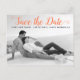 Moderne Korallenskripte Hochzeit Save the Date Foto Postcard. Dieses zeitgenössische Typografie Save the Date Design zeichnet sich durch ein Schwarz-Weiß-Foto des Ehepaares und den Text "Save the Date" in einem modernen Script-Schriftart aus.