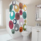 Dieser Duschvorhang hat ein modernes Design von Kreisen mit Sternexplosionen und Kreisen mit Kreisen in Retrofarben.