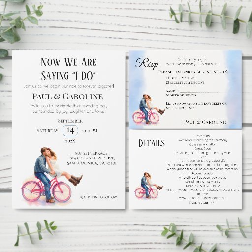 Feiern Sie die Liebe auf Rädern mit dieser romantischen Verlobung-Einladung, die eine Aquarellbilder eines Pärchens auf einem rosa Fahrrad enthält. Dieses moderne und lässige Design eignet sich perfekt für Outdoor- oder Country-Parties. Passen Sie den Text mit Ihren Namen, Datum, Uhrzeit und UAWG an. Ideal für diejenigen, die eine frische und herzliche Ankündigung mit einer Touch von Launen gewollt.