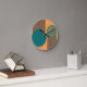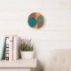 Diese Uhr hat ein modernes Kreislaufdesign in der Mitte des Jahrhunderts mit aquamarinen und schwarzen Linien auf einem orangefarbenen Feld.