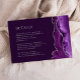 Der rechte Rand dieser eleganten, modernen Hochzeitsdetails Gehäuse-Karte verfügt über eine lila Aquarellgrenze mit Imitaten silbernen Glitzer bestickt. Der Titel erscheint in römischen Serifen-Hauptstädte, mit anpassbarem Text unten in silbergrauem Kupferstich-Schriftart auf einem lila Hintergrund. Auf der Rückseite ist ein lila und silberfarbenes Design erkennbar.