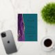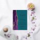 Der links Rand dieser eleganten, modernen Hochzeitseinladung zeichnet sich durch eine lila Aquarellgrenze aus, die mit Imitaten mit goldenem Glitzer bestickt wurde. Der anpassbare Text kombiniert Handschrift, Copperplate und kursiv Schriftart in realer Goldfolie auf aquamarinem blauen Hintergrund. Auf der Rückseite ist ein lila und goldenes Design zu sehen.