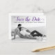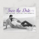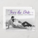 Moderne lila Skripthochzeit Speichern Sie das Date Foto Postcard. Dieses zeitgenössische Typografie Save the Date Design zeichnet sich durch ein Schwarz-Weiß-Foto des Ehepaares und den Text "Save the Date" in einem modernen Script-Schriftart aus.