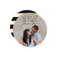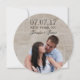 MODERNE LINIEN | FOTO SAVE THE DATE KARTE | RUNDE KARTE ELKE CLARKE© Diese und andere Farben und Stile sind unter www.zazzle.com/epclarke verfügbar. Moderne Ankündigung Datum freihalten mit dem Verlobung Foto auf der Vorderseite mit schwarz-elegantem Script-Schriftart-Textüberlagerung. Auf der Rückseite ein fett, schwarz und cremefarben Streifen Muster Hintergrund hat die Hochzeitsankündigung Text können Sie anpassen. Andere Farben sind verfügbar.
