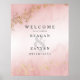 Moderne Luxe Gold Flecks Blush Pink Mist Wedding Welcome Poster. Elegantes, zeitgenössisches Hochzeitsplakat in einem üppigen, rosafarbenen Marmornebel mit luxuriösen goldenen Flecken. Dieses maßgeschneiderte, traumhafte Hochzeitsdesign kann leicht mit Ihren eigenen Hochzeitsdetails personalisiert werden.
