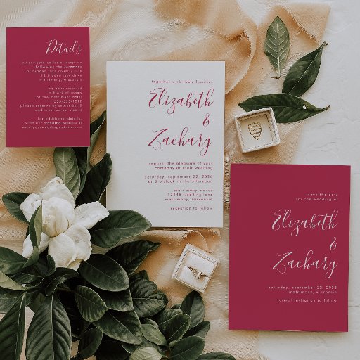 Diese einfache, moderne Hochzeitseinladung enthält magentafarbenen Text auf weißem Hintergrund. Fügen Sie die Namen der Braut und Bräutigam in stilvoller Handschrift Kalligraphie und die Details in sans serif Schriftart. Die Rückseite ist ein passender Schatten von massivem Magenta.