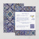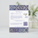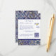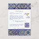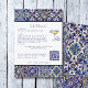 Charmantes mediterranes Fliesendesign auf dieser Details Umschließkarte für eine moderne italienische Hochzeit. Lass deinem Gast, dass du eine Hochzeitswebseite mit mehr Informationen hast und lassen sie scannen QR-Code, um die UAWG zu antworten. Thema: la Dolce Vita, blaue Fliesen, italienisch, Zitronencocktail, mediterrane, Hochzeit in Urlaubsort - Südeuropa.