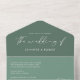 Einfach Siegel und schicken Sie diese Einladungen: Dreifach Hochzeitseinladung mit einer trendigen RSVP-Karte. Dieses trendige Sage Green All In One Wedding Invitation enthält saubere Kalligraphie-Skript, moderne Typografie auf zwei Tönen von Salbei Green. Löschen Sie die Adresse des Empfängers, um das Leerzeichen für Adressaufkleber verlassen. Keine Notwendigkeit, RSVP-Karten oder Gehäuse-Karten zu verschicken - diese Hochzeitseinladung Design deckt alle Ihre Bedürfnisse ab. Editieren Sie einfach den Text nach Ihren Wünschen.