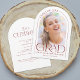 Diese dezent-weiße, schlichte, minimalistische Abschluss-Karte dient sowohl als Ankündigung des Abschlusses als auch als Party Einladung des Abschlusses und bietet ein Foto, einen Bogenrahmen und eine elegante moderne Typografie.