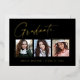 Saubere, trendige, moderne und elegante "3-Foto" Abschluss-Ankündigung Goldfolienkarten (Ihre Wahl von Silber oder Rose-Folie), mit Designelementen moderner Texte mit einem einzigartigen kalligraphischen Tintenskript. Die Fotos des Absolventen werden mit einem delikaten und minimalistischen partiellen Reiter betont. Die Kartenrückseite bietet personalisierte Textstellen für Informationen über Ihren Abschluss oder können gelöscht werden, wenn Sie eine Nachricht übergeben möchten. Schwarz mit Goldfolie oder einfach anpassen Sie den Hintergrund an die Grundfarbe Ihrer Schule oder eine beliebige Farbe Ihrer Wahl. Perfekt für die High School, Uni und Uni Student Senior.
