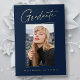 Saubere, trendige, moderne und elegante "Foto"-Abschluss-Ankündigung Goldfolienkarten (Ihre Wahl von Silber oder Rose-Folie), mit Designelementen moderner Texte mit einem einzigartigen kalligraphischen Tintenskript. Das Foto des Absolventen auf der Vorderseite der Karte ist mit einem delikaten & minimalistischen partiellen Reiter akzentuiert. Die Kartenrückseite bietet personalisierte Textstellen für Informationen über Ihren Abschluss oder können gelöscht werden, wenn Sie eine Nachricht übergeben möchten. Navy Blau mit Goldfolie oder einfach anpassen Sie den Hintergrund Ihrer Schule zu der Grundfarbe oder eine Farbe Ihrer Wahl. Perfekt für die Gymnasialstufe, die Uni und den Hochschulstudiengang.