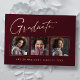 Saubere, trendige, moderne und elegante "3-Foto" Abschluss-Ankündigung Goldfolienkarten (Ihre Wahl von Silber oder Rose-Folie), mit Designelementen moderner Texte mit einem einzigartigen kalligraphischen Tintenskript. Die Fotos des Absolventen werden mit einem delikaten und minimalistischen partiellen Reiter betont. Die Kartenrückseite bietet personalisierte Textstellen für Informationen über Ihren Abschluss oder können gelöscht werden, wenn Sie eine Nachricht übergeben möchten. Burgundy rot mit Goldfolie oder einfach anpassen Sie den Hintergrund, um die Grundfarbe Ihrer Schule oder eine beliebige Farbe Ihrer Wahl. Perfekt für die High School, Uni und Uni Student Senior.