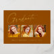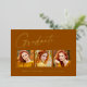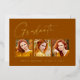 Saubere, trendige, moderne und elegante "3-Foto" Abschluss-Ankündigung Goldfolienkarten (Ihre Wahl von Silber oder Rose-Folie), mit Designelementen moderner Texte mit einem einzigartigen kalligraphischen Tintenskript. Die Fotos des Absolventen werden mit einem delikaten und minimalistischen partiellen Reiter betont. Die Kartenrückseite bietet personalisierte Textstellen für Informationen über Ihren Abschluss oder können gelöscht werden, wenn Sie eine Nachricht übergeben möchten. Orange, Rostfarben mit Goldfolie oder einfach den Hintergrund anpassen, um die Grundfarbe Ihrer Schule oder eine beliebige Farbe Ihrer Wahl anzupassen. Perfekt für die High School, Uni und Uni Student Senior.