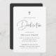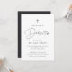 Erleben Sie die einzigartige Atmosphäre und das Ambiente des kleinen Hauses mit den modernen und minimalen Einladungen in Schwarz und Weiß. Einfache Design-Features "Dedication" in lässigen handgeschriebenen Skripten, mit Ihrer Zeremonie und Feierlichkeiten Details unter dem modernen Softash schwarzen Buchstaben. Eine kleine, moderne Kreuzillustrierung rundet das Design ab.
