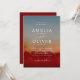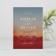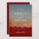 Einfaches und modernes Hochzeitseinladungs-Design mit tiefrotem, orangefarbenem und staubblauem abstrakten Hintergrund. Ideal für Herbst- und Winterhochzeiten.