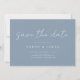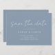 Eine schlichte, moderne Save the Date Karte. Personalisieren Sie dieses minimalistisch staubige blau-weiße Design, um Ihre persönlichen Daten und Botschaft zu haben.