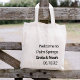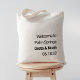 Herzlich willkommen in Ihrer Hochzeit in Urlaubsort mit diesen schicken und modernen personalisierten Taschen. Design-Features "Willkommen zum [Ziel]" in schwarzen Sans Serifenschrift mit Ihren Namen und Hochzeitsdatum darunter, ausgerichtet unten rechts für einen minimalistischen, Mitte des Jahrhunderts modernen Look.