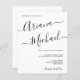 Diese moderne Minimalistische Hochzeitseinladung verwendet eine elegante und einfache schwarze Schriftzeichen-Typografie. Personalisieren Sie diese Einladungsvorlage mit den Namen der Braut und des Bräutigams. Chic und stilvoll, die Namen des Paares hervorzuheben. Tipp: Um die langen Schwanz-Glyphen auf den Namen behalten, behalt die kleinen Quadrate auf jedem Ende des Namens. *Bitte beachten Sie auch, dass die Größe dieser Einladungen nicht die standardmäßige Größe des Mailings ist. Einige Länder haben Aufschläge für keine Standardgrößen.