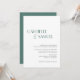 Diese moderne Hochzeitseinladung zeichnet sich durch ein minimalistisches Design aus, das die Namen der Braut und des Bräutigams in einem einfachen serifenlosen Schriftart darstellt. Die moderne Einladung wird durch eine dunkelweiss grüne Farbe betont.