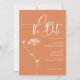 Modernes minimalistisches und einfaches Design. Moderne Mischung aus handgeschriebener Typografie in Weiß, wunderschön orangefarbenem Hintergrund und mit subtiler blumengeschmückter Touch - weiße Skizze von Königin Anne Lace. Sie können den Wortlaut, den Stil, die Farbe und die Größe dieser Einladungskarte personalisieren. Verfügbare Elemente in der Auflistung zuordnen