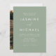 Einfache, elegante Einladungen mit einem weißen, handgeschriebenen Skript, kombiniert mit modernen Schriften vor einem schlauen grünen Hintergrund. Personalisieren Sie die minimalistische Hochzeitseinladung mit Ihrem Namen und Ihre Hochzeitsdetails. Die Einladung kehrt sich um, um Ihr vollblütiges vertikales Verlobung-Foto anzuzeigen. Die eleganten und grünen Einladungen sind die perfekte Wahl für moderne Hochzeiten.