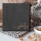 Diese schicke Notenkarte enthält Ihren Namen in einer handgeschriebenen Karamellskriptkalligraphie "a note from" auf einem bedrückten grauen schwarzen Chalkboard-Effekt-Hintergrund. Für eine edgy moderne Wirkung. Die Typografie ist stilvoll in der unteren rechten Ecke platziert. Die Rückseite der Notenkarte ist weiß.