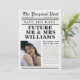 Minimalistische Kalligraphie Zeitung Hochzeit speichern das Datum mit drei Fotos, einem der Bräutigam und Braut als Kinder und eins von ihnen als Erwachsene.
