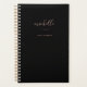 Moderner Goldplaner in Schwarz und Imitat. Personalisierter Skriptname und dekorativer Swash. Ideal für geschäftliche, berufliche oder persönliche Notiz- und Zielplanung. Beginnen Sie jederzeit.