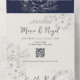 Einfache, klassische, minimale, moderne, marineblaue All-in-One-Hochzeitseinladung mit QR-Code, einzigartiges Monogramm mit silberblühenden Spitzen, trendige, handgeschriebene Schrift und ein individuelles Bild des Hinters. Fügen Sie Ihr Foto, Ihre Hochzeitsdetails und uAwg.