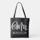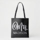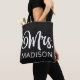 Das zweiseitige Design dieser personalisierten Hochzeitstotentasche präsentiert ein auffallendes und zeitgenössisches Monogramm in einem modischen, weißen Schriftart vor einem Hintergrund von schwarz. Das Monogramm zeigt elegant den verheirateten Nachnamen der Braut, der in einer fett und modern geschriebenen Mrs.
