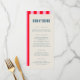 Dieses moderne Hochzeitsmenü, das eine wunderschöne Touch zu Ihren Empfang-Tischen bietet, besticht durch seine schicke, kühne Typografie mit einer schönen Farbpalette. Die Vorderseite ist schlicht und minimalistisch, und dann umdrehen Sie sie für einen farbenfrohen Aufbruch mit leuchtend rosa und roten Streifen!