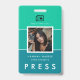 Ein modernes und minimalistisches Namensschild und Foto Abzeichen Press ID, perfekt für jeden Nachrichtenberuf: Journalisten, Reporter, Fotografen, etc.. Vollständig anpassbare Hintergrundfarben. Sie können auch einfach Ihren Strichcode oder QR Code für die Sicherheit hinzufügen.