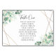 Horizontal Modern Names Greenery Eukalyptus Geometric Wedding Tischnummer. Verfügt über Aquarellfarben Eukalyptus-Blätter und einen goldenen geometrischen Rahmen.
