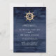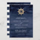 Dieses moderne nautische Schiff-Helm formale Hochzeitseinladung ist perfekt für eine Kreuzfahrt oder eine Hochzeit am Strand. Das einfache Design verfügt über ein goldenes Bootsrad auf einem marineblau blauen Untergrund.
