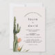 Moderne Orange Floral Cactus Wedding Invitation Modern style cactus themed wedding Einladung mit einem blassorangen blühenden Kaktus auf einem staubgrauen Hintergrund.