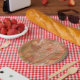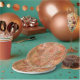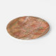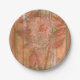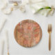 Moderne orangefarbene Blütendrucke auf gestreiftem Pappteller