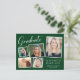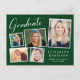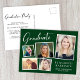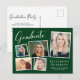 Moderne grüne Graduiertenparty mit Postkarte mit einer 5-Foto-Collage verstreuter Bilder in weißen Rahmen, "Graduate" in einem schicken weißen Drehbuch, der Name des Grads in eleganter weißer Typografie und ihre Schule und Klasse Jahr in schlicht weißer Typografie. Fügen Sie Ihre Party-Details auf der Rückseite hinzu.