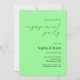 Eine Einladung, die moderne Ästhetik mühelos mit dem Versprechen der Liebe verbindet - unsere moderne Minimalistische Script Black and Mint Green Engagement Party Einladung. Set vor dem Hintergrund eines erfrischenden Pfefferminzgrüns verkörpert diese Einladung perfekt den Geist des zeitgenössischen Designs und reflektiert gleichzeitig die Spannung Ihres nächsten Events. Gegen die beruhigende grüne Leinwand ist der Text sorgfältig rechts begründet und schafft eine fesselnde visuelle Anordnung, die das Auge lenkt. Die Worte "Verlobungsfeier" sind akribisch in einem Kalligrafie-Script-Schriftart geätzt und verschmelzen nahtlos moderne Eleganz mit einer Touch zarten Charmes. Diese Schriftart-Wahl dient als elegantes Vorspiel für die Feierlichkeiten, die vor uns liegen. Der restliche Text wird in einer Auswahl von einfachen Schriftart präsentiert, die jeweils sorgfältig in verschiedenen Grau- und Schwarztönen kuriert werden. Diese sorgfältige Gestaltung sorgt für Klarheit und eine subtile visuelle Hierarchie und führt Ihre Gäste durch die wesentlichen Veranstaltungsdetails. Ihre Verlobung markiert den Beginn einer schönen Reise, und unsere moderne Minimalistische Script Black and Mint Green Engagement Party Einladung erfasst diese Stimmung fehlerfrei. Es ist nicht nur eine Einladung, sondern auch ein Sake, der Ihre einzigartige Liebe und die wertvollen Erinnerungen symbolisiert, die bald erschaffen werden. Lass dieses Set die Bühne für deine Feier und lade deine lieben ein, an der Freude und Spannung dieses bemerkenswerten Meilensteins in deinem Leben teilzunehmen.