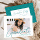 Wir laden Sie ein, den Abschluss mit unserer modernen Foto-Abschlussfeier zu feiern. Die trendy Graduierungsparty lädt das Foto des Absolventen mit "Graduate" in einem aquamarinen, modernen Kalligraphieüberlagerungen ein. Personalisieren Sie die Front der Einladungen, indem Sie den Namen des Absolventen, die Schule und Abschluss Jahr. Die Einladung kehrt um, um Ihre Graduiertenpartien Details und ein trendy aquamarin-weiß gepunktetes geometrisches Muster anzuzeigen.
