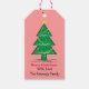 Weihnachtsbaumgeschenke in einem modernen pastellfarbenen Schema. Personalisieren Sie mit Familiennamen auf der Vorderseite und Liebe Peace Joy Typografie auf der Rückseite. .Der festliche Weihnachtsbaum mit Lichtern und Stern auf der Oberseite verleiht den Weihnachtsmarken fröhliche Weihnachtswünsche. Original Illustration durch Sema.