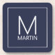 Modernes, minimalistisches Design mit personalisiertem Monogramm und Namen in weißem, modernem Sans Serif Schriftart auf marineblau Hintergrund.