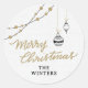 Verleihen Sie Ihren Weihnachtsgeschenken mit diesem handgezeichneten schwarzen und goldenen Weihnachtsbaumkugel-Aufkleber eine moderne festliche Eleganz. Mit zarten hängenden Ornamenten, warmer goldener handgeschriebener Schrift, die "Merry Christmas" liest, und Platz, um ihn mit Ihrem Familiennamen zu personalisieren, passt dieses Design perfekt zu den passenden Karten, Geschenkpapieren und Geschenkanhängern aus derselben Kollektion. Ideal zum Verschließen von Umschlägen, zum Dekorieren von Geschenken oder zum Hinzufügen eines stilvollen letzten Schliffs zu Ihrer Weihnachtsverpackung.