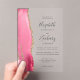 Die links Seite dieses eleganten, modernen Hochzeitseinladens besticht durch einen rosa Aquarellstreifen, der mit vergoldetem Imitat bestickt ist. Der anpassbare Text kombiniert handschriftlich, kopperplate und kursiv Schriftart in Holzkohlegrau auf einem klaren Hintergrund.