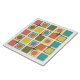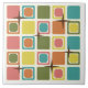 Ein Retro-Kunstmuster aus den 50er Jahren mit geometrisch abgerundeten Quadraten und Sternen im atomaren Stil. Vielfarbig in leuchtendem, lebendigem Rosa, Orange, Grün, Gelb und Blau.