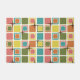 Ein Retro-Kunstmuster aus den 50er Jahren mit geometrisch abgerundeten Quadraten und Sternen im atomaren Stil. Vielfarbig in leuchtendem, lebendigem Rosa, Orange, Grün, Gelb und Blau.